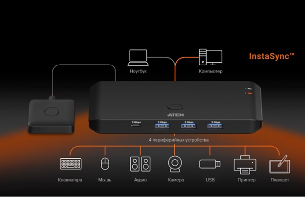 - Одним нажатием — переключение общих USB‑устройств между двумя компьютерами (например, клавиатура/мышь, камера, гарнитура, внешний накопитель).