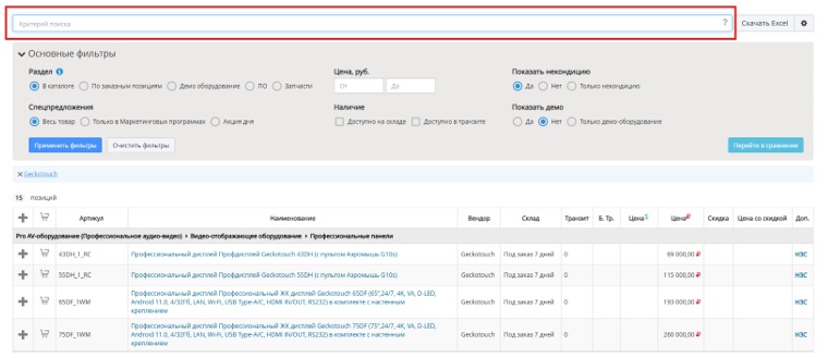 - 6. После этого в критериях поиска можно указать конкретный артикул, диагональ или любой другой параметр, по которому нужно найти оборудование.