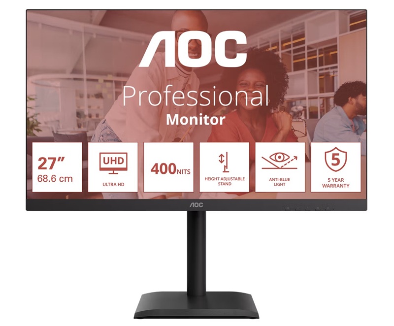 | U27E4CV | 27" AOC 3840x2160 WLED 16:9 IPS 400cd, 1200:1, 20M:1, 4ms, 178°/178°, 2xHDMI, DP, USB hub: 4*USB3.2, USB-C(90W), RJ45, 60Hz, Speakers, Tilt, Height, Swivel, Pivot, VESA, Internal, Black, 3y |