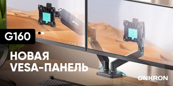 Представляем вашему вниманию обновлённый настольный кронштейн для двух мониторов ONKRON G160. Теперь прикрепить монитор стало ещё удобнее благодаря быстросъёмной VESA-панели.