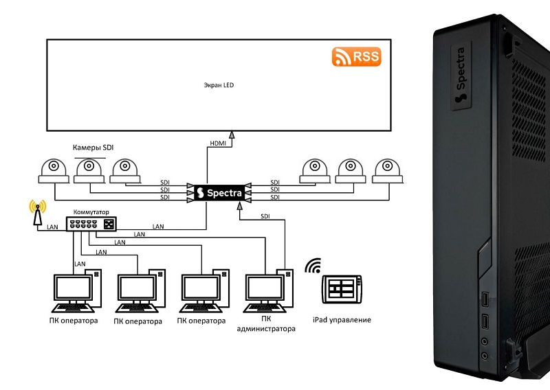 В диспетчерских и ситуационных центрах видеопроцессор Spectra позволяет оперативно выводить необходимые данные с разных источников в многооконном режиме на большие экраны и при этом не теряться в потоке информации. Есть возможность управлять большой сетевой структурой каналов информации просто с планшета или компьютера оператора.