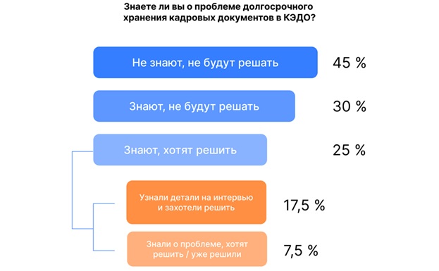 Согласно результатам интервью, 45% компаний не знают о рисках долгосрочного хранения и не планируют решать этот вопрос. Еще 30% изучали тему при внедрении КЭДО, но не считают необходимым пересматривать существующие подходы. Только 25% респондентов разбирались во всех требованиях, из них часть планирует внедрение систем электронного архивного хранения, а небольшая доля компаний уже перешла на такие решения.
