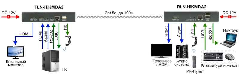 Схема применения приёмника KVM HDMI RLN-HiKMDA2