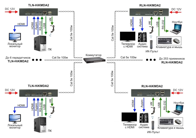 Схема применения комплекта KVM HDMI TLN-HiKMDA2+RLN-HiKMDA2