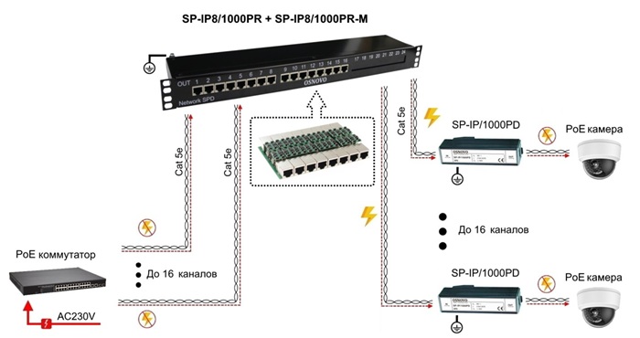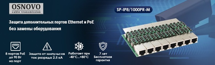 Компания OSNOVO представляет решение - дополнительный модуль SP-IP8/1000PR-M на 8 портов с поддержкой PoE. Конструкция модуля позволяет легко установить его непосредственно в базовые модели стоечной грозозащиты OSNOVO SP-IP8/1000PR или SP-IP16/1000PR. При этом обеспечивается полноценная защита каждого из 8 портов с номинальным током разряда 2.5 кА. Время отклика защитного контура составляет менее 1 нс, что гарантирует моментальное срабатывание при импульсных перенапряжениях до 600 В (линия-земля).